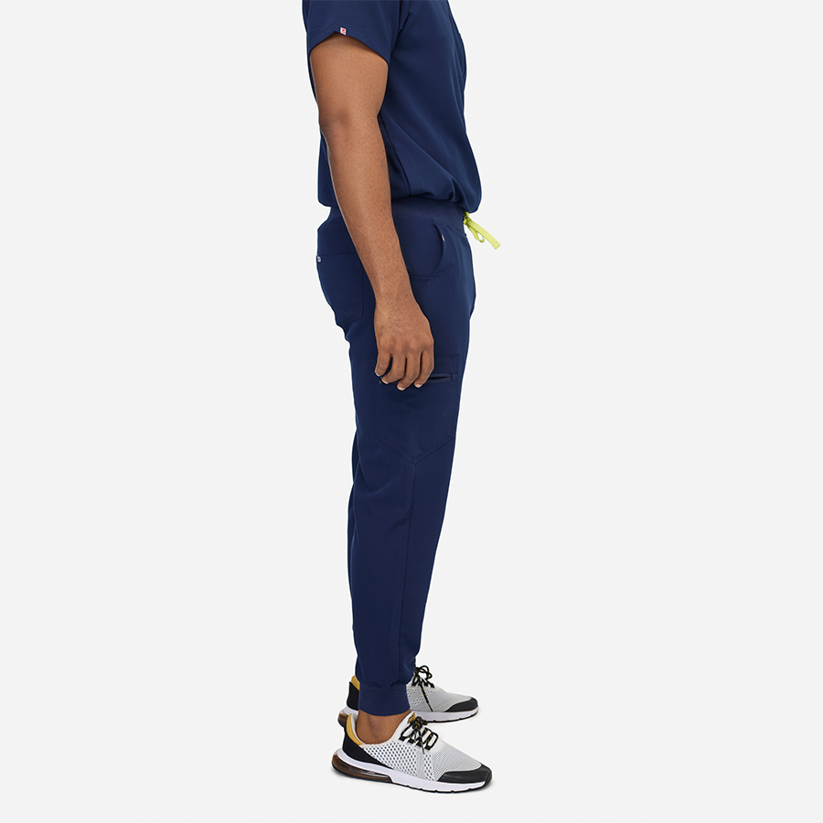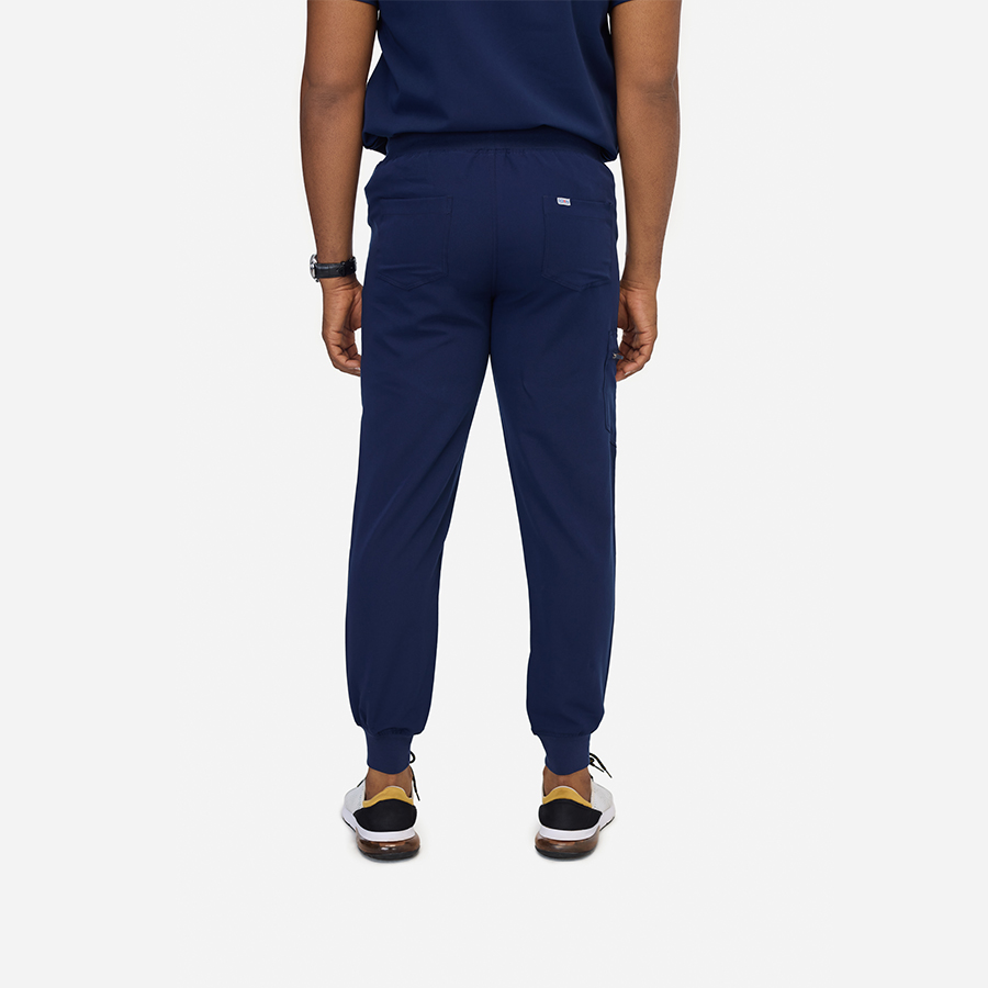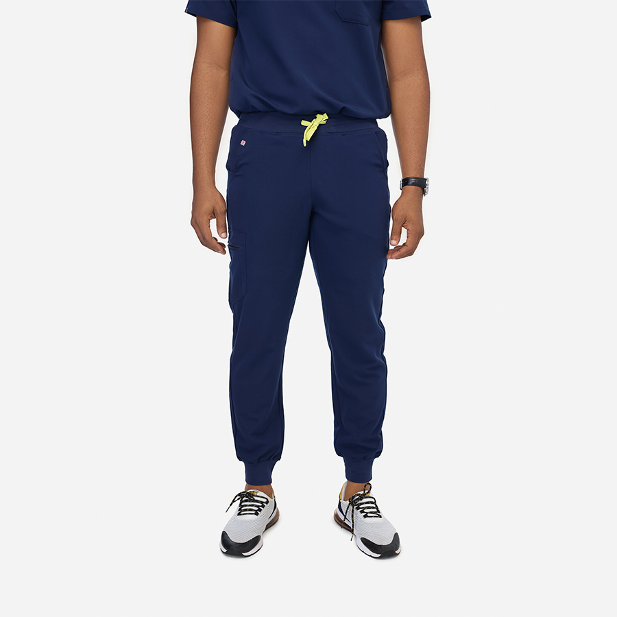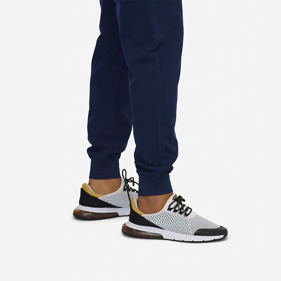 Jogger-style scrub pant with breathable fabric, five pockets, and ankle cuffs for a comfortable and secure fit.