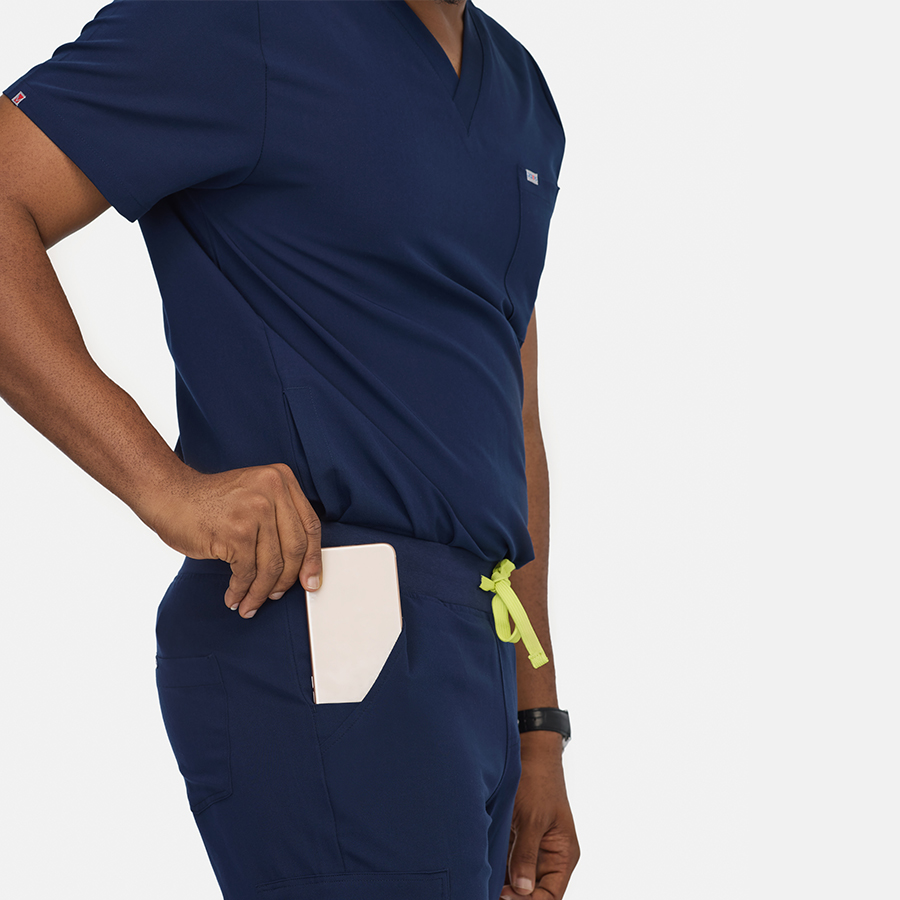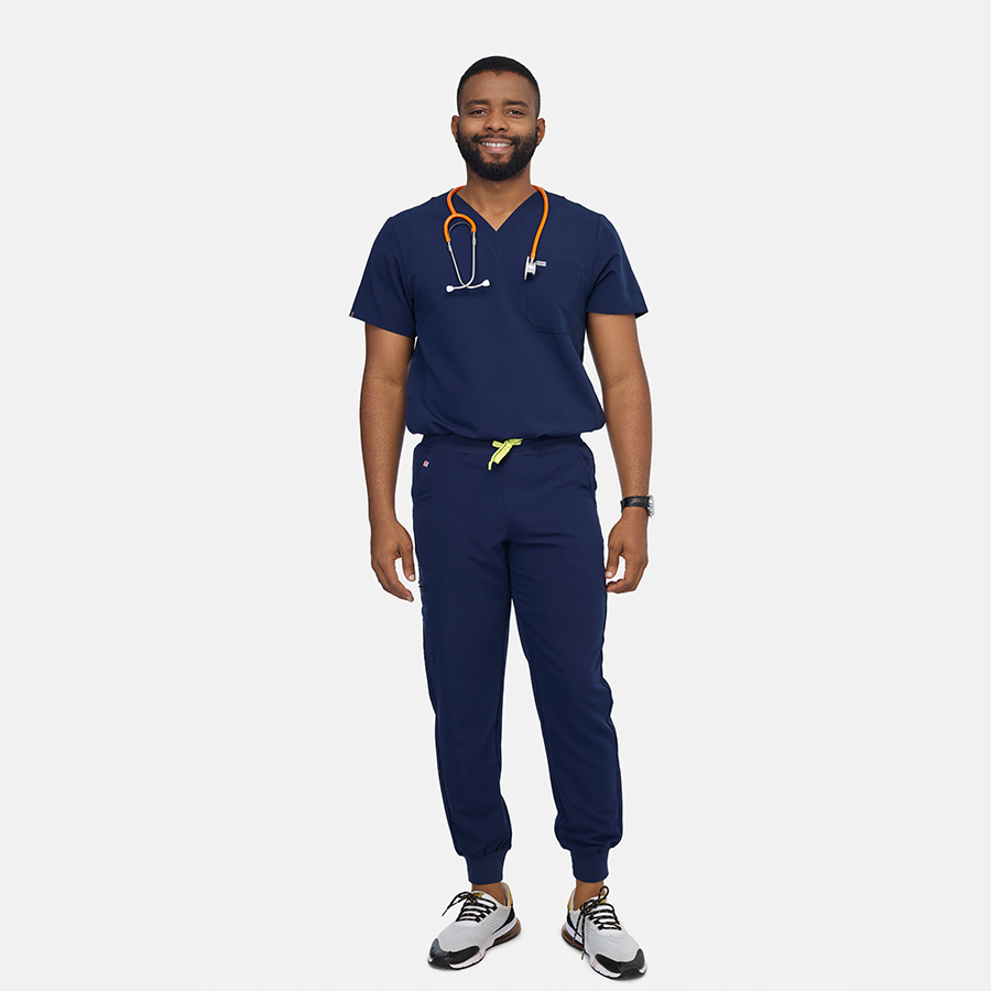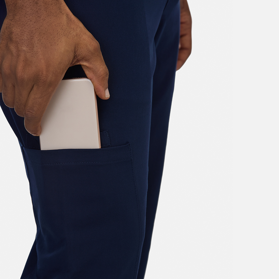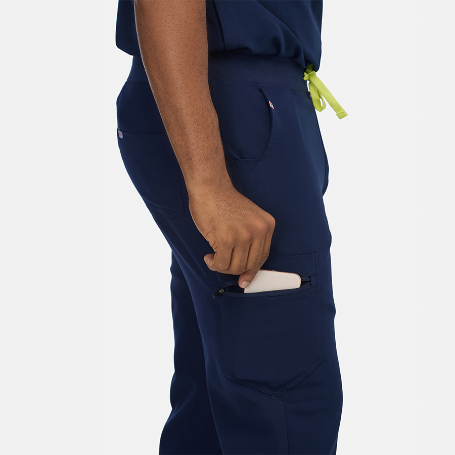 Jogger-style scrub pant with breathable fabric, five pockets, and ankle cuffs for a comfortable and secure fit.